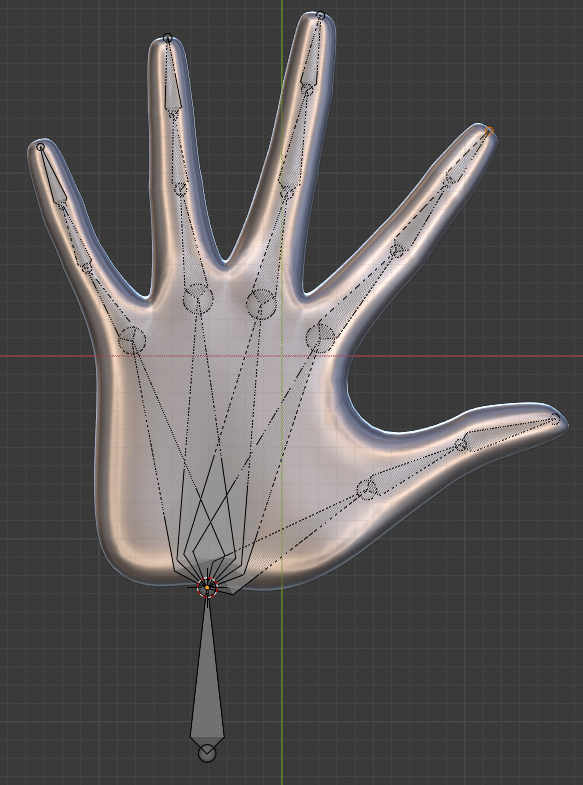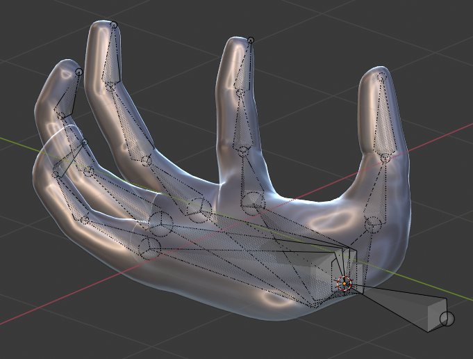 Now, let’s make the hand do something interesting. Move the 3D cursor to the base of the hand (Shift+Right Click). Add an Armature. Move the root bone so that it is entirely outside of the hand. Extrude (E) the rest of the bones, lining them up as best you can to hand joints. Exit Edit Mode, select the hand, Shift+select the armature, and press Ctrl+P to set the hand’s parent to the armature. Select Add Automatic Weights.