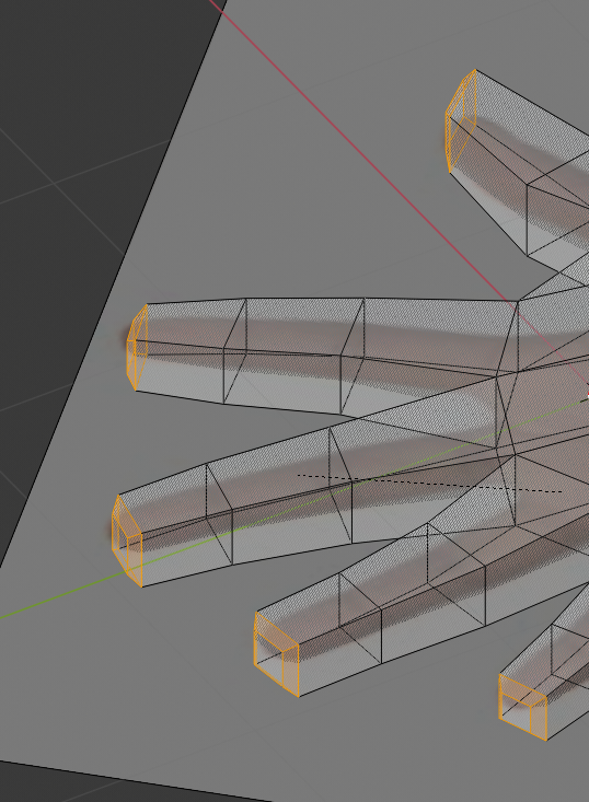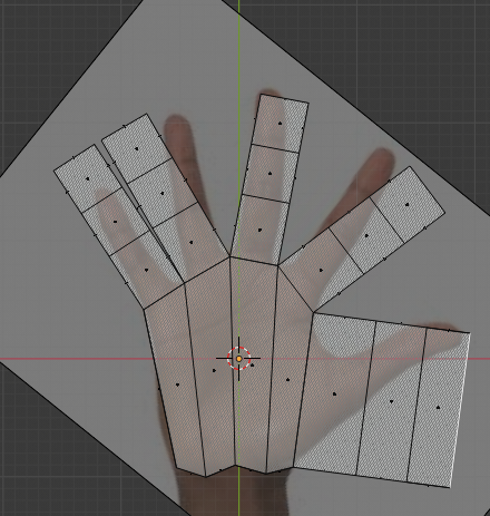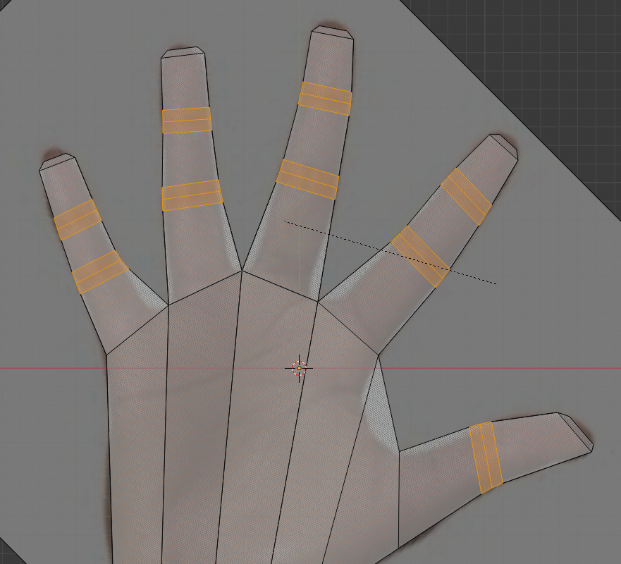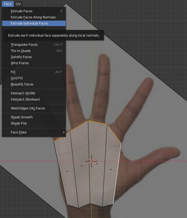 Select the faces at the base of each digit. Go to the Face menu (or press Ctrl+F) and click Extrude Individual Faces. This will create distinct geometry out from each selected face. Repeat this two more times for each finger segment. We’ll turn the first thumb segment into a part of the palm, so it’s okay to have 3 segments there too. Finesse everything again, placing edges across knuckles and joints.