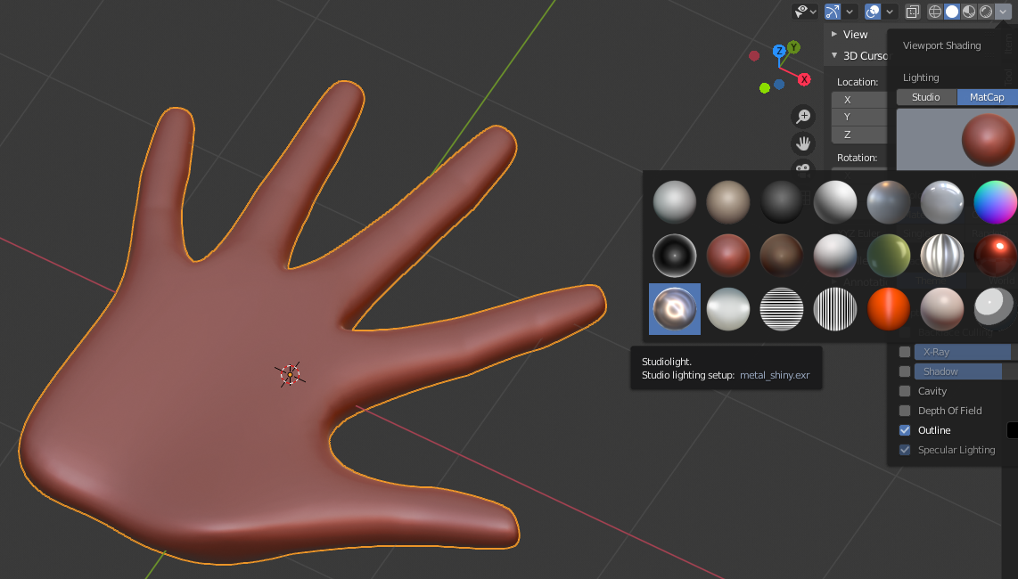 Remember to adjust the back of the hand, to give it some curve and visible knuckles. Select the whole mesh and go to Mesh > Shading > Smooth Faces. While in the Solid Viewport Shading Mode (solid circle in the top right), you can click the dropdown arrow to apply a MatCap to the object. These are a great way to get a better feel for how your mesh actually looks.