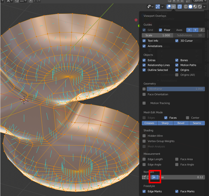 Normals - Enable face normal lines at the bottom of Viewport Overlays. Press